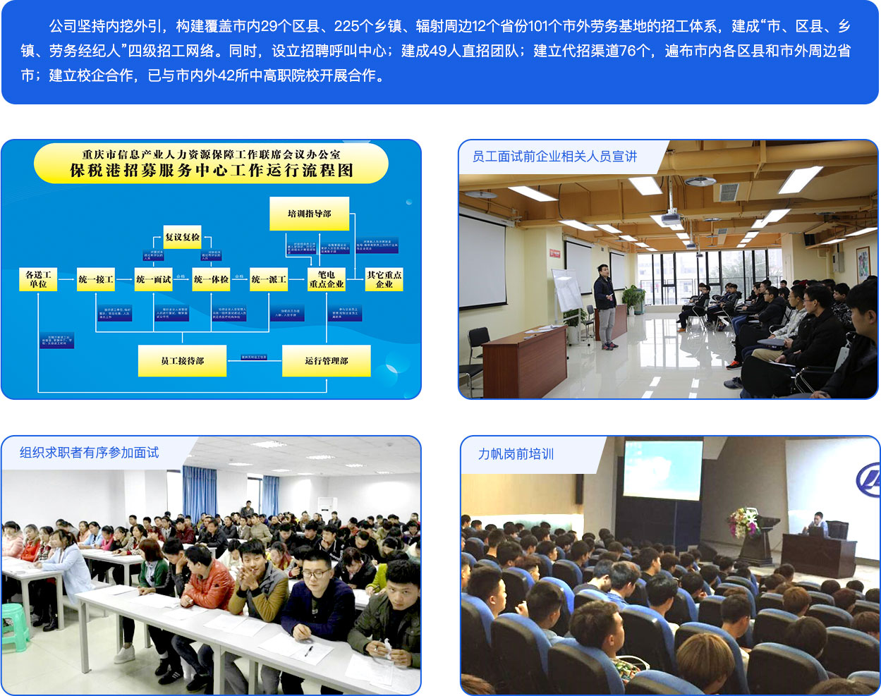 市場化用工保障將圍繞藍(lán)領(lǐng)人員的招募、培訓(xùn)、服務(wù)等開展工作。堅持立足重慶、領(lǐng)先西部、布局全國為目標(biāo)。建立直招網(wǎng)絡(luò)平臺、合伙人連鎖門店制度、供應(yīng)商聯(lián)合共贏保障機制、校企聯(lián)合實踐等“直代為主、校企補充”的立體綜合人力儲備供應(yīng)模式。推進(jìn)崗前職業(yè)技能入門、中期崗位能力提升培訓(xùn)等人員培訓(xùn)機制。立足于堅守服務(wù)重慶為重點,堅守服務(wù)工業(yè)制造業(yè)為初心,堅守服務(wù)社會為責(zé)任。努力做好并承擔(dān)國有人力資源公司應(yīng)盡的服務(wù)就業(yè)、服務(wù)民生、服務(wù)社會的擔(dān)當(dāng)和使命。